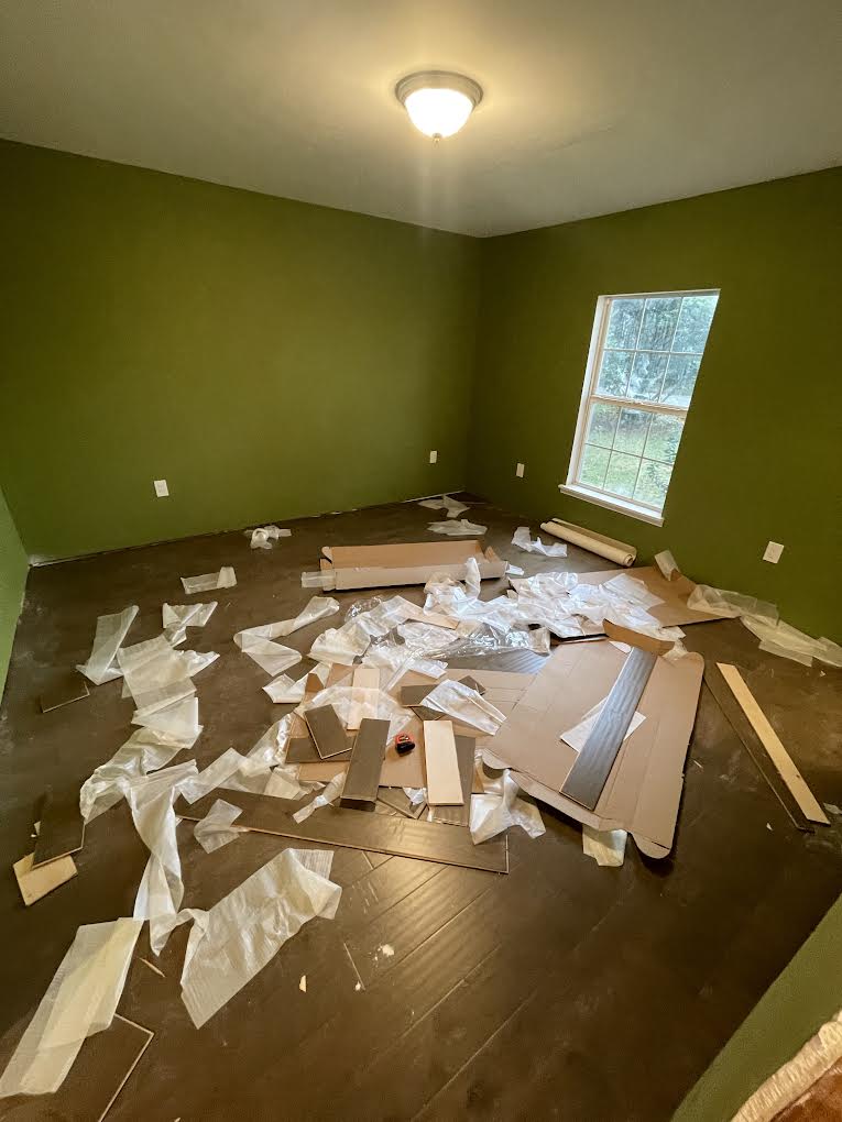As we wait, the house progress slowly but surely moves forward. The flooring is getting done and is almost finished. The people laying the flooring are getting done.