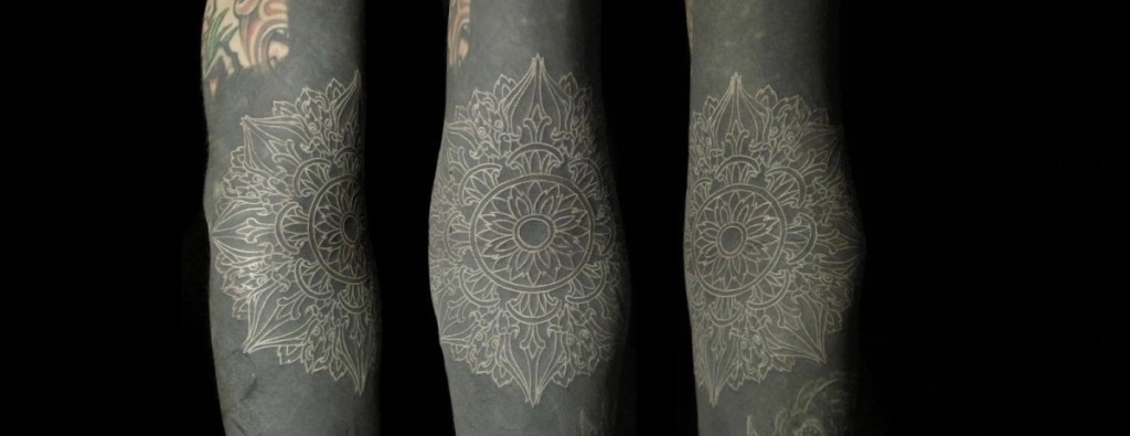 Although the above photo looks amazing, that tattoo’s white is going to get swallowed up by the black in a few years. Just think of the jaguar or black panther tattoo your grandpa has/had… that over time, became all black with no detail due to time and weather. That’s what is going to happen to the detail in those white work tattoos. The black surrounding them will swallow them up.