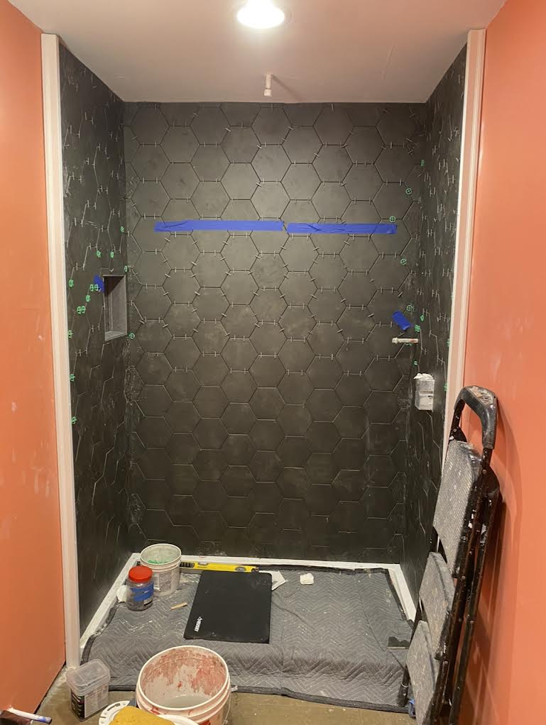 This part got contracted out. The tiling would have taken us a lot longer than just a few days to do. The grouting gets done tomorrow, which is awesome. Once that gets done we are going in to tackle the rest of the bathroom shelving and the like.